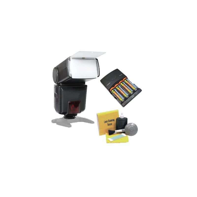 This Item Includes: 1. Flash 2. Flash Pouch 3. Flash Diffuser 4. Flash Reflecting Plate 5. AC Rapid Battery Charger 6. 4 (2900Mah) Batteries 7. 5 Piece Cleaning Kit