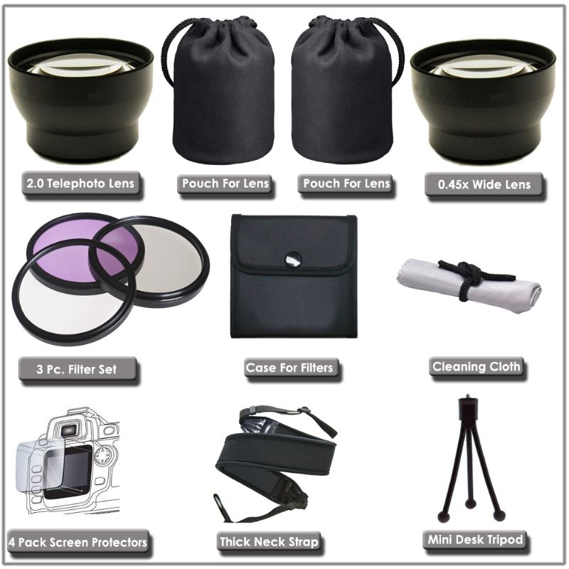 Digital NC newly released kit. Includes: LENS: 2.0x Telephoto Conversion Lens (Black Finish), Get much closer to the action with this professional grade telephoto conversion lens. Great for sports, scenery, and events! This Item Includes: Wide lens, Lens bottom cover, Lens cap, Lens pouch, LENS: 0.45x Wide Angle Lens w/ Macro, Capture the entire scene with this wide angle conversion lens. Ideal for nature shots, sports and events! -- This Item Includes: Wide lens, Lens bottom cover, Lens cap, Lens pouch. FILTERS 1. UV Lens Filter 2. Polarizing Filter 3. Flourescent Filter 4. Filter Pouch. Lens filters improve photographs by giving photographers control over light and allowing them to emphasize the features of a scene that they consider most important.This filter kit is a combination of the three essential filters no photographer should be without. UV--Film and a digital CCD are more sensitive to UV light than our eyes are. This often shows up in images shot from high altitudes and long distances especially over water. This filter will remove the UV light and more importantly protect your lens from moisture, scratches, and damage. Polarizer--provides color and contrast enhancement. Reflected light often shows up as a whitish glare that washes out color in an image. A polarizing filter will correct this problem creating deep blue skies. It also removes glare from non-metallic surfaces such as windows and water.FLD--provides color correction when shooting under fluorescent lighting. It will remove the greenish tint from the image, providing pleasing skin tones and true to life color renditions. Warranty:10 year. Made in Japan.